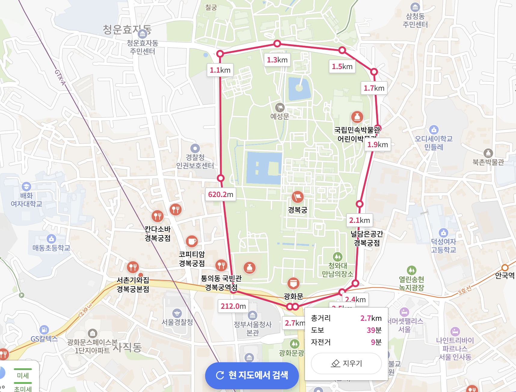 네이버 지도에서 거리를 재보았더니 2.7km 입니다. 스마트워치로 걸으면서 측정했을 때는 3km 였는데, 약간 차이가 있습니다.